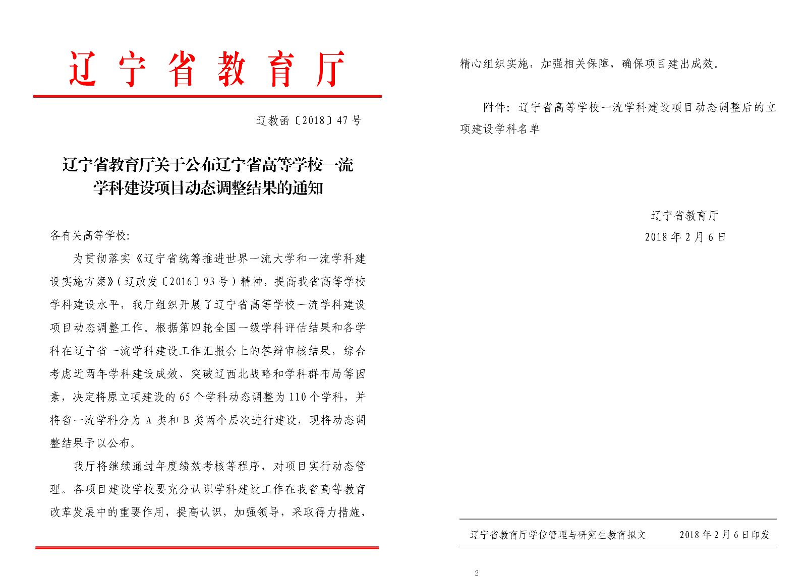 据了解,2018年1月,辽宁省教育厅组织开展了辽宁省高等学校一流学科建设项目动态调整工作,根据第四轮全国一级学科评估结果,综合考虑学科布局、传统优势、建设基础、社会贡献、学科声誉等因素,经过省学位委员会审核、汇报答辩、厅党组审议等环节,最终全省共有110个学科入选本轮一流学科建设项目(其中A类100个,B类10个)。