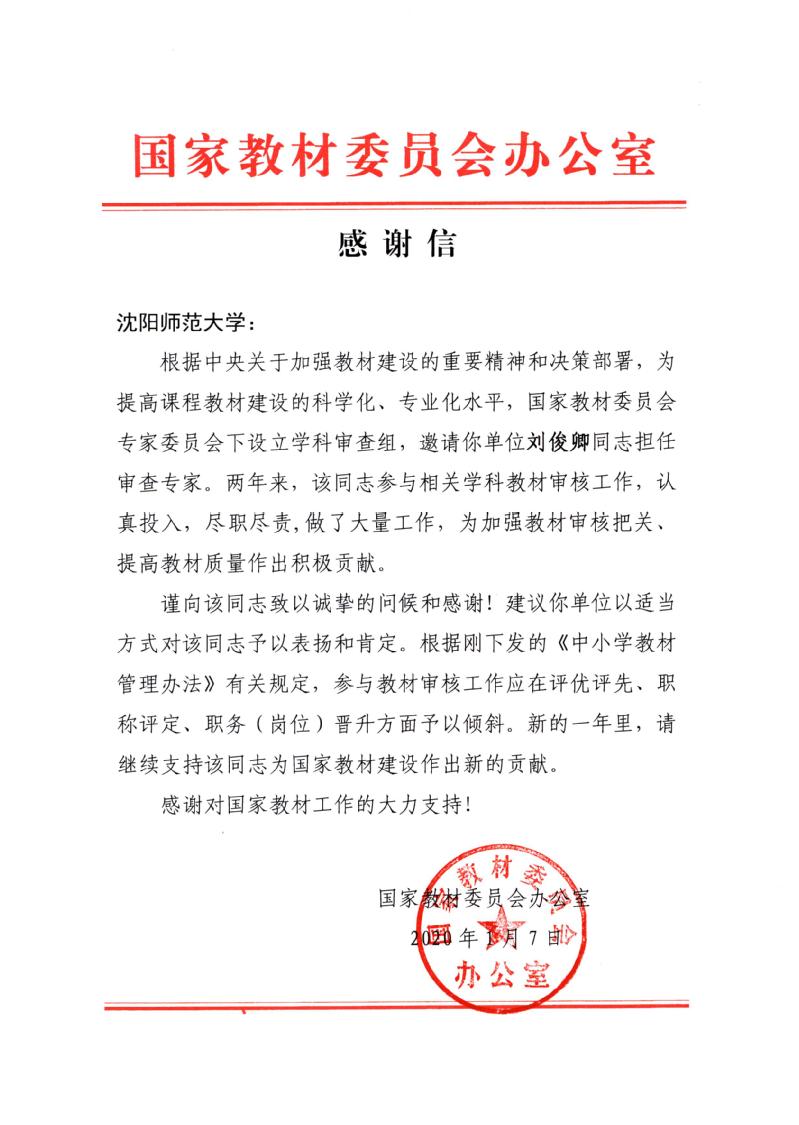 2020年1月7日,国家教材委员会办公室致函我校,对我院教育学专业刘俊卿教授近两年来参加聋哑学校义务教育国家教材的审核工作给予了高度肯定和评价,认为刘俊卿老师“认真投入,尽职尽责,做了大量工作,为加强教材审核把关,提高教材质量作出了积极贡献。”