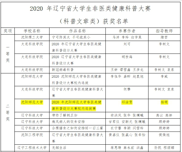 2020年11月1日至11月20日,由辽宁省普通高等学校创新创业教育指导委员会、辽宁省大学生非医类健康科普大赛组委会联合举办的“辽宁省大学生非医类健康科普大赛”在沈阳医学院顺利举行,通过20天的线上评审,于近日公布了本次大赛的获奖名单。