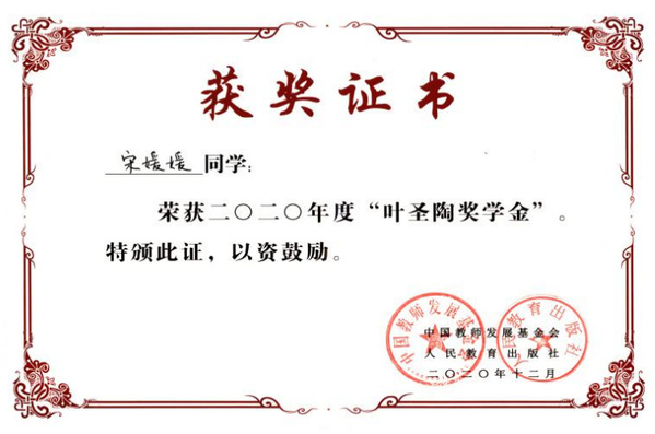 2020年12月,ty8天游平台登录2017级教育学专业本科生宋媛媛同学获得由中国教师发展基金会和人民教育出版社共同颁发的2020年度“叶圣陶奖学金”。“叶圣陶奖学金”是在教育部教师工作司的指导下,在人民教育出版社出资支持下,专项用于奖励全国师范大学全日制师范专业本科优秀在校生,号召同学们学习弘扬人民教育出版社首任社长叶圣陶先生的教育精神,鼓励同学们积极投身教育事业并长期从教、终身从教,为国家和民族培养出更多的优秀人才。目前,宋媛媛同学已被保送至首都师范大学攻读硕士学位。