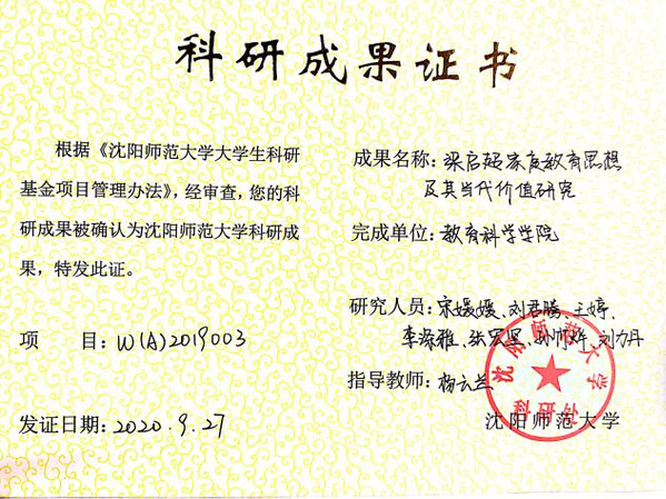 宋媛媛获得的各类荣誉和奖励证书在科研方面。宋媛媛同学从大一开始便主动参加大学生科研活动。大一学年通过和朋友参加大学生挑战杯项目,让她对科研产生某种兴趣,初步积累有关学术研究的少许经验。后跨专业参与第八届全国大学生电子商务“创新、创意及创业”挑战赛校选拔赛获三等奖。大二学年参与项目《基于HTML5技术的人工智能科普知识交互媒体设计制作》获校级A类科研成果结题;参与家长信使-青年创客筑梦乡村教育振兴社会公益服务项目获得校第二届“互联网+”大学生创新创业大赛银奖;主持乡村学生幸福研究社会公益服务项目获得校第二届“互联网+”大学生创新创业大赛铜奖。大三学年开始主持项目《梁启超家庭教育思想及其当代价值研究》获得校级A类成果结题;同时主持校级大学生创新创业训练计划项目《乡村学生幸福研究》结题。在学院的学术年会暨创新创业论坛中,所撰写的论文《梁启超家庭教育思想及其启示》、《大学生读书观研究》获得三等奖。大四学年经过前期经验的累积,在两位优秀导师指导下,经过虚心请教和反复修改,发表《论梁启超家风家教的现代价值》、《浅议幼儿家园共育中的问题及解决策略》两篇专业相关论文。在科研道路上不急不躁,宋媛媛同学一直在慢慢成长。