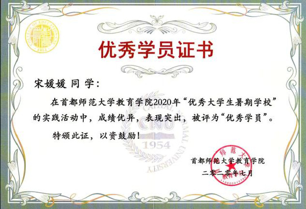 宋媛媛获得的大学生暑期学校优秀学员证书一枝粉笔写尽古往今来;两袖清风堪称清正廉明;三尺讲台道尽千秋佳话;四季晴雨立志奉献终生。宋媛媛心中一直有个愿望——成为光荣的教师。德国哲学家雅斯贝尔斯说:“教育的本质是一棵树摇动另一棵树,一朵云推动另一朵云,一个灵魂唤醒另一个灵魂。”在大四上学年两个多月的教育实习过程中,她努力备课上课、撰写教学设计、完成作业批改,课下试图走进孩子们的心灵,用爱感染他们。在大四下学年的教育实习中,她将继续带着一份热忱投入到涉及基础教育阶段的实习工作中,学习更多的知识,收获更多的实践经验。在学校第十三届模拟面试大赛决赛的舞台上,宋媛媛曾满含深情地说:“教师是美的耕耘者、播种者,他们循循善诱润泽学生的心田、塑造学生纯洁的灵魂;他们把爱洒向被遗忘的角落,用温暖的手抚慰不被注意的心灵。而我,定会成为他们中的一员。”今后,她将更加主动地学习教育教学理念,积累丰富的专业知识,努力提高教师素养,为培养未来社会主义建设者和接班人不断奋斗,心系教育,终身从教。