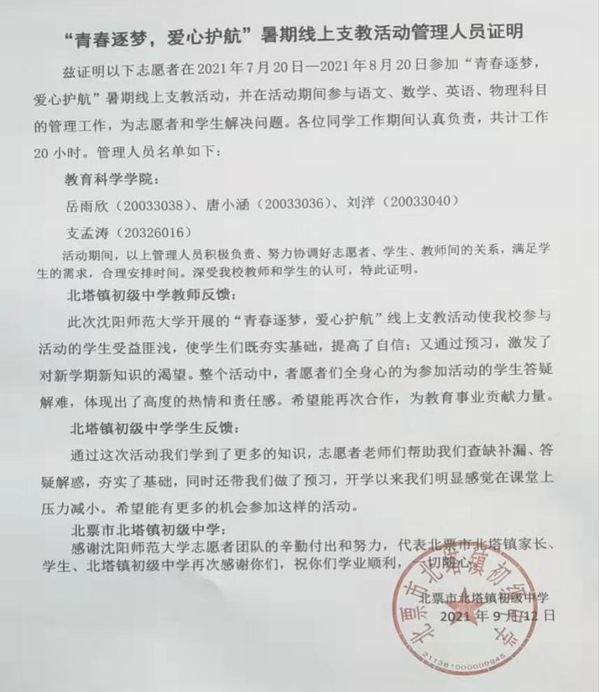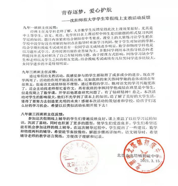 北塔初级中学位于辽宁省北票市北塔镇,师资力量薄弱,教育资源落后。为支援该地区的教育建设,锻炼沈师学子的实战教学能力,弘扬我校之教学风尚,ty8天游平台登录研究生和本科生积极策划和进行“青春逐梦 爱心护航”线上支教活动。此次线上支教活动共分为2021年1-2月的寒假支教、2021年7-8月的暑假支教两个阶段。