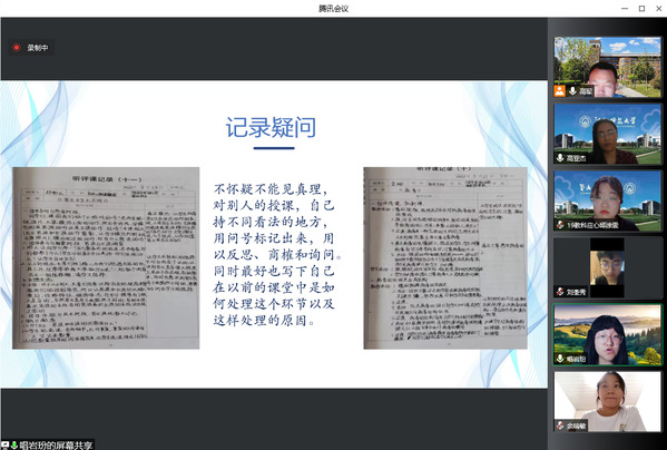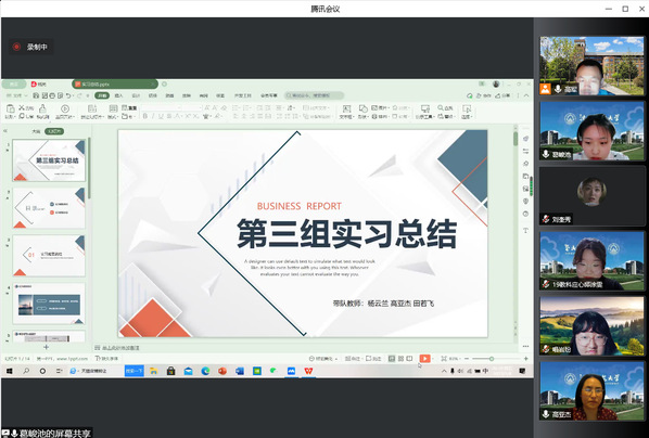 在实习总结会上,6个实习小组分别派出1名实习生代表本组图文并茂地从实习手册等材料的填写、听评课、教研活动、教学设计、收获感悟、不足与改进等方面做了实习成果的分享和汇报。各小组同学一致认为,虽然线上实习有其缺点,但也有其突出的优点,现代信息技术为线上实习提供了切实的技术支撑和优质资源依托,赋予了师范生在名师名课的教学观摩和听评课等方面更多的自由选择权利,为自身教师教育技能的提升提供了有力的支撑。高军副院长、杨硕朱艳、朱艳主任和高亚杰老师对小组的实习汇报做了相应的点评。