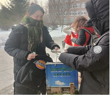 12月16日,博文楼、汇文楼、弘文楼、国际商学院4个四六级考点共有我院10名志愿者在楼前手持引导牌,为考生提供保管电子设备的服务,并现场装进信封,妥善保存。天气寒冷,雪花纷纷,也不能阻挡志愿者的热情,他们始终面带笑意,为我院考生送上最真挚的祝愿。