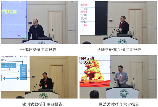 主旨报告上半场由研究生院院长卢伟主持。东北师范大学于伟教授以《好老师要关注研究儿童》为题,指出教育要尊重教育的对象——儿童的发展规律,并以率性教育为例说明教育要遵循儿童的身心发展规律的重要性。中国教育科学研究院马陆亭研究员以《以教育家精神 浸润广大教师成长》为题,指出通过教育实践,教育家对个体教育思想的形成产生重要影响,教育家不一定是教育学家,教育学家也不一定能够成为教育家,教育家思想的形成一定有其相应的理论积淀。华东师范大学熊川武教授以《高阶教学与教师发展》为题,阐释了高阶教学的概念,并从教学目标、教学情境、师生互动、教学过程、教学手段、教学结果六个方面系统说明高阶教学与普通教学之间的关系。辽宁大学周浩波教授以《落实教育家精神铸魂强师行动 建设高素质专业化教师队伍》为题,以“四个要求”为出发点,阐述落实教育家精神的重大意义;结合新时代以来习近平总书记重要论述,分析了教育家精神的丰富内涵;并根据全国教师队伍建设情况,尤其是辽宁省教师队伍建设情况以及宣传教育家精神的具体行动,提出了落实教育家精神、铸魂强师行动的实践路径。