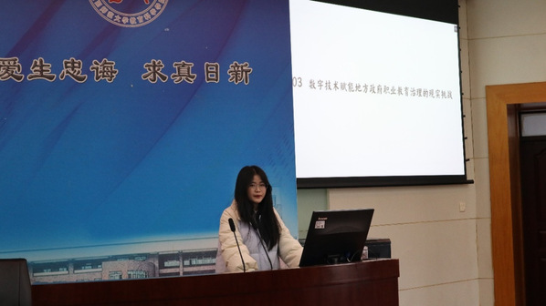 第一场报告会由孙默同学主持。周凤玲同学以《数字技术赋能地方政府职业教育治理的内在逻辑、现实挑战及实践路径》为题做主旨报告。该报告首先对数字技术、地方政府职能、教育治理和数字治理等术语进行相关概念界定。她指出地方政府职业教育治理的内在逻辑在于其韧性、科学性和产教融合方式,并就目前地方政府职业教育治理面临相关的问题,提出地方政府通过建设技术支持能力体系与配套机制、加强地方政府职业教育数字治理相关研究等方式,探究地方政府职业教育治理的实践路径。