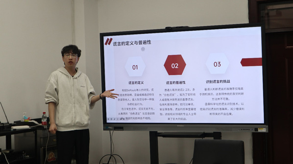 第二位报告人李懿峰同学以《基于语言线索及非语言线索下的谎言识别》为题报告。李懿峰首先解释了谎言的定义、普遍性、以及识别谎言的挑战。随后介绍了语言线索分析的量表,利用量表讲述了实际案例,进行实践。接下来介绍了非语言性线索分析,以微表情导入,介绍了面部编码系统以及声音压力分析,以及肢体语言的神经机制,量化技术与挑战。最后提出多模态融合技术的构成、研究突破、跨文化挑战,在技术层面、逻辑层面的展望。