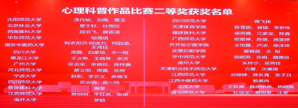 为深入贯彻党的二十大精神和全国研究生教育工作会议精神,进一步全面推进教育强国建设,由中国学位与研究生教育学会应用心理专业学位工作委员会主办,全国应用心理专业学位研究生教育指导委员会指导,华中师范大学心理学院承办的2024年全国应用心理专业学位研究生实践技能大赛决赛于2024年12月7日至8日在华中师范大学南湖校区举行。我院学子最终在全国决赛中斩获心理科普作品比赛二等奖、应用心理案例开发比赛三等奖,创造所有参赛作品均获奖的历史最好成绩!