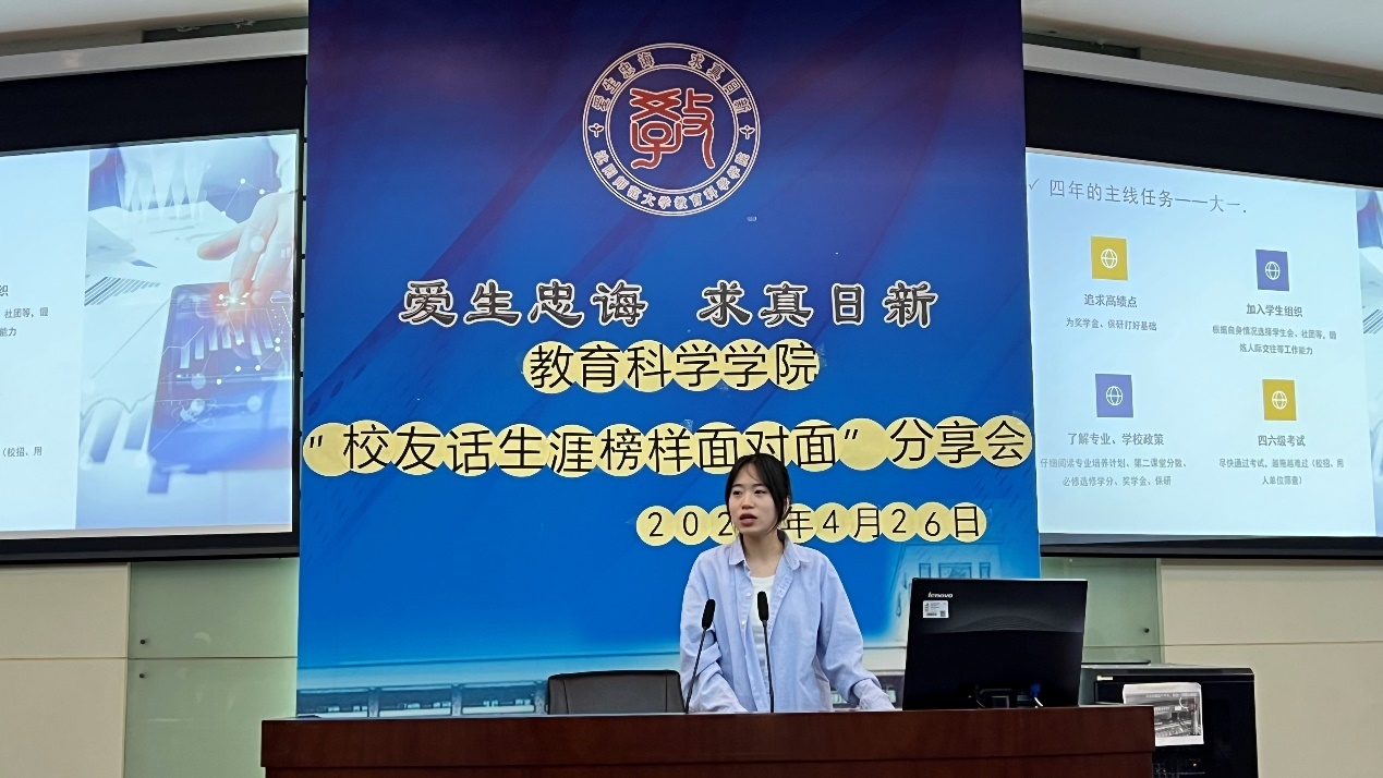 第二位是2024届应用心理学专业本科毕业生,现任于辽宁省第二女子监狱某监区的分监区长王子涵校友。她先从大学四年的主线任务展开,给同学们提供各种建议。例如,四六级考试要尽快考越早考越容易过,想要保研得奖学金就要认真学习追求高绩点,如果想要丰富个人生活锻炼自己的交流能力就加入学生组织,大三大四要规划好毕业论文的撰写时间以及关注各种就业信息……随后王子涵校友细致的为同学们介绍了考研和考公考编以及它们的报考流程,帮助学生们少走弯路。因为王子涵校友是考公上岸的,所以她精心为学生们展示了考公的各种真题,让学生身临其境体验考公试题。在分享的最后,王子涵校友寄语道,“只要往前走,就都向着阳光,祝学弟学妹们未来的路光芒万丈!”提问环节上,针对学生提问的问题,她说要抓住机遇,而且无论是考研还是考公考编大家都要保证拥有好的心态。