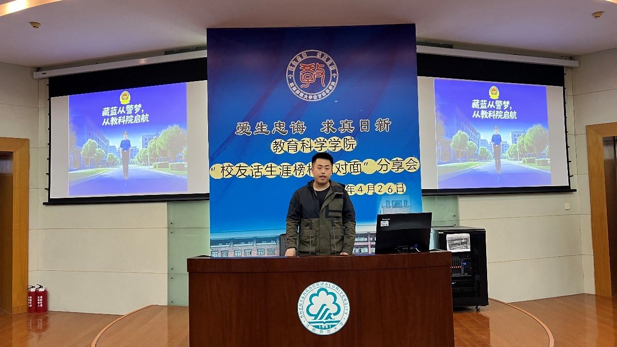 第三位是2019届应用心理学专业本科毕业生,现任于中国刑事警察学院的辅导员、团委书记金雨时校友。重返自己的母校沈阳师范大学金雨时校友倍感亲切,他用轻松欢乐的语气回忆着自己的大学生活,也让学生们倍感亲切与共鸣。在这样欢乐的气氛下,金雨时校友用一张张生动的照片向学生们展示中国刑事警察学院的一日生活制度,让学生们了解了其他大学的日常生活。而在提供建议方面,他只强调了一句话——选择大于努力。希望学生们对自己有一个清晰的认识,并且“早做规划,明确目标”,不要做一只无头苍蝇毫无目标荒废时光。在提问环节,金雨时校友面对学生提出的问题提醒道,在大学期间要多实践多锻炼,每一次的锻炼都将会成为以后成功路上的垫脚石!