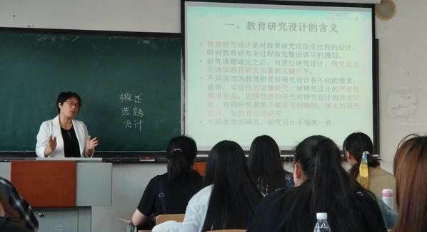 朱老师首先带领全班同学简要回顾了前两次课的学习内容,“温故而知新”,然后引入了本次课的主题内容——教育研究设计概述。本节课,朱老师结合自身的课题申报经历深入浅出地讲授了“教育研究设计的含义、目的与意义、基本环节等内容,并辅以一定的研究设计类的题目对学生学习效果进行当堂检验。