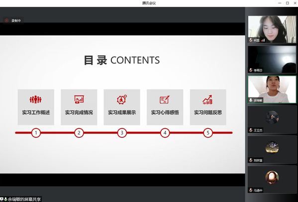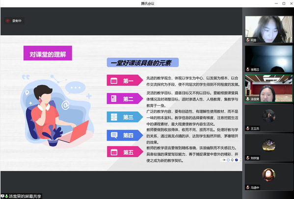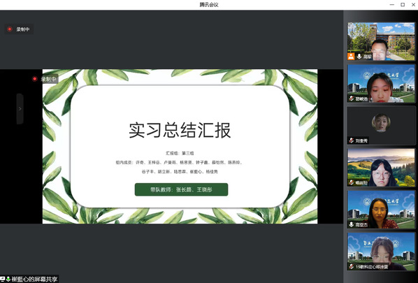 在实习总结会上,6个实习小组分别派出1名实习生代表本组图文并茂地从实习手册等材料的填写、听评课、教研活动、教学设计、收获感悟、不足与改进等方面做了实习成果的分享和汇报。各小组同学一致认为,虽然线上实习有其缺点,但也有其突出的优点,现代信息技术为线上实习提供了切实的技术支撑和优质资源依托,赋予了师范生在名师名课的教学观摩和听评课等方面更多的自由选择权利,为自身教师教育技能的提升提供了有力的支撑。高军副院长、杨硕朱艳、朱艳主任和高亚杰老师对小组的实习汇报做了相应的点评。